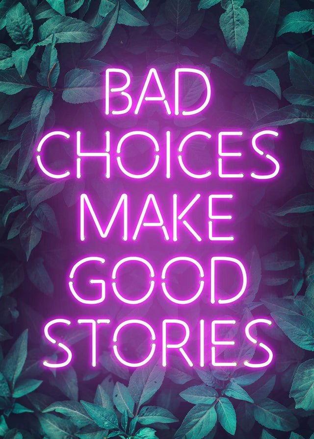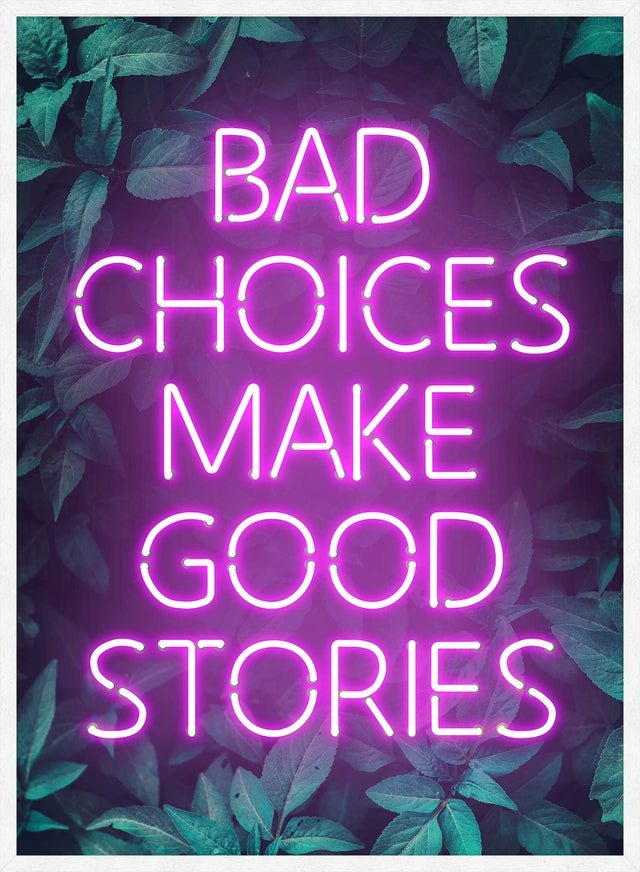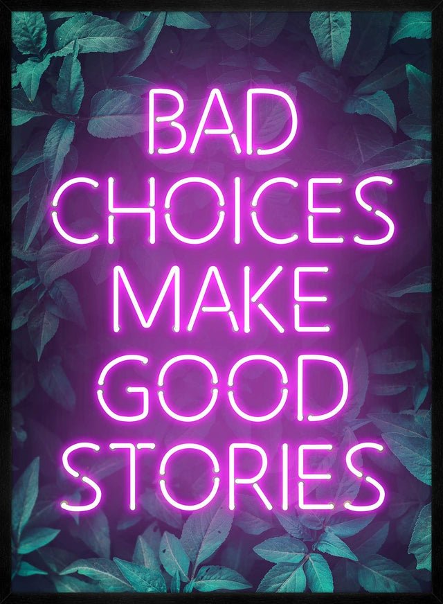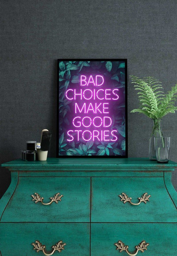 We've all made them, bad choices and bad decisions. But... they do make good stories! Cool Neon slogan typography print that is perfect for any style of interior design or home decor.