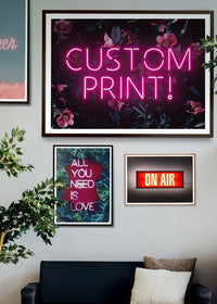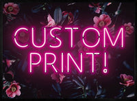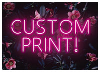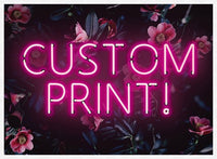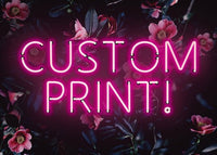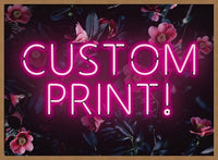 Simply fill in the custom text box underneath, and we will typeset your favourite saying in our beautiful, bright glowing Neon lettering! Please note that you will have to trust us on the design & layout (take a flick through the examples), as these prints are non-refundable unless damaged or faulty. But fear not as our in-house designers will make it look great! Please note there is a 100 character limit on these prints, but the Neon text does look better with smaller phrases.