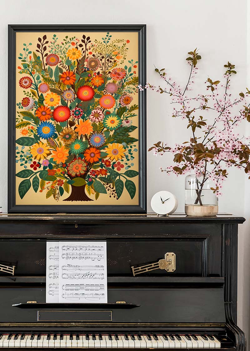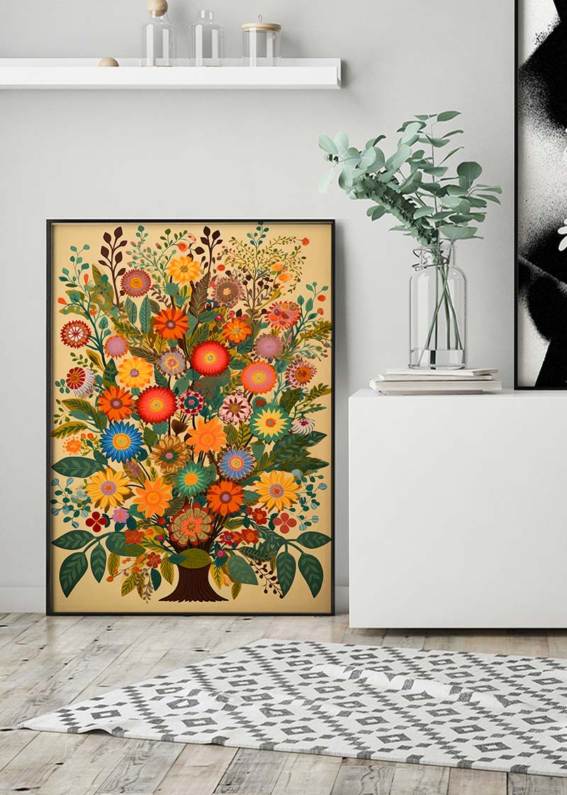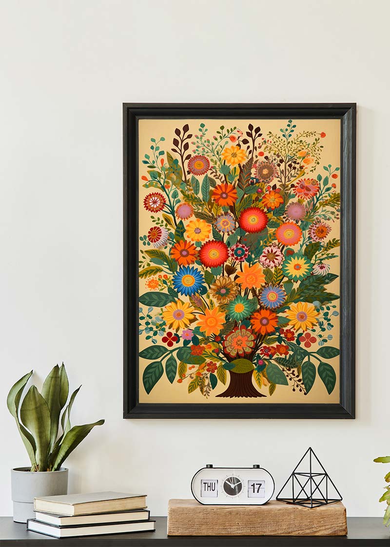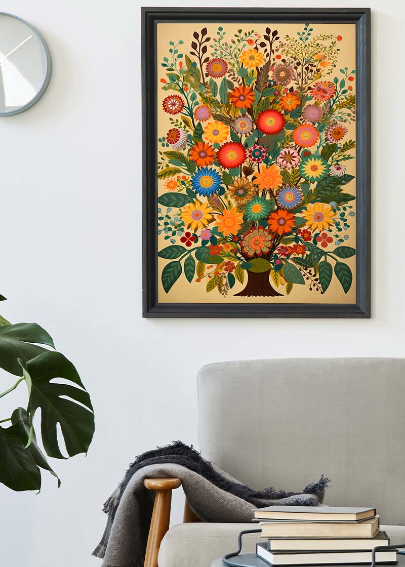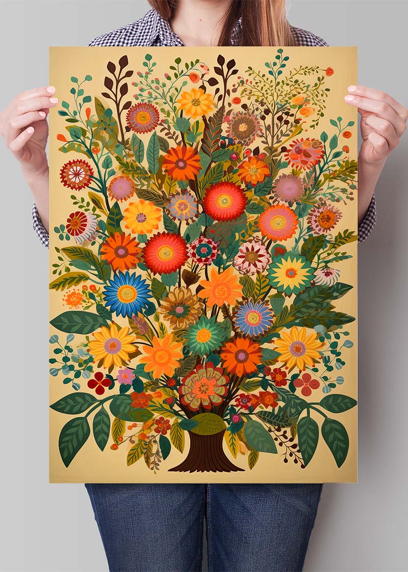 Transform your space into a vibrant haven of creativity with our folk art-inspired vintage floral print! Embrace the allure of naive painting, where every brushstroke exudes charm and character. This captivating piece is more than just a print; it's a testament to individuality and style.