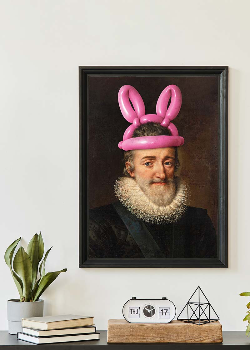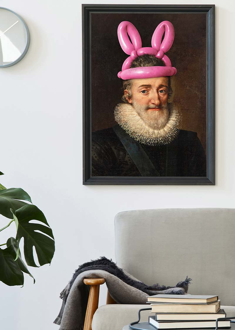 This portrait painting of the French King of France King Henri IV, has twisted balloon bunny rabbit ears added over the top, in super realistic altered art editing! These graffiti prints are perfect for the living room, hallway, bedroom, and more. They make amazing additions to gallery walls too!