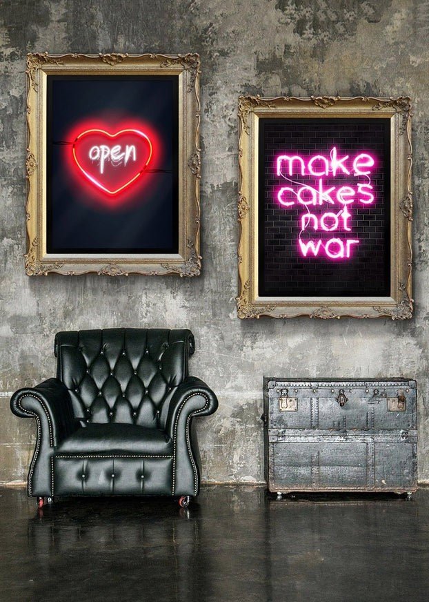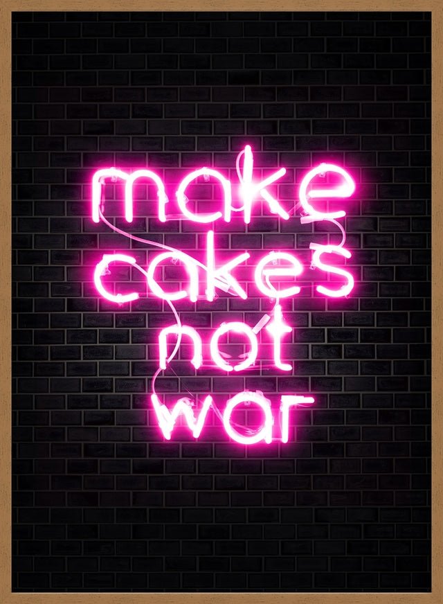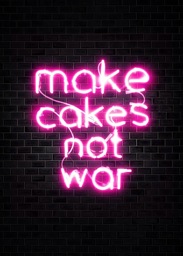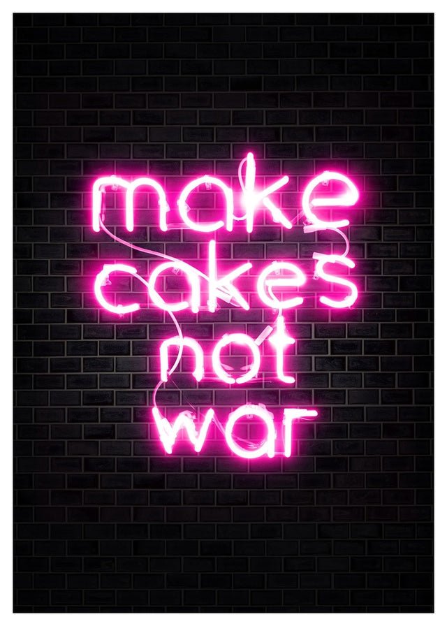 Striking graphic print on thick, 250gsm archival art paper. This beautiful photographic print depicts a the slogan "make cakes not war" set over black metro tiling. Perfect for any aspiring bakers! Insert some of the neon trend into your home with our range of neon poster artwork. NOTE: We recommend choosing a GLOSS finish for our Neon prints, they look amazing on our 200gsm gloss paper and it suits the artwork perfectly.