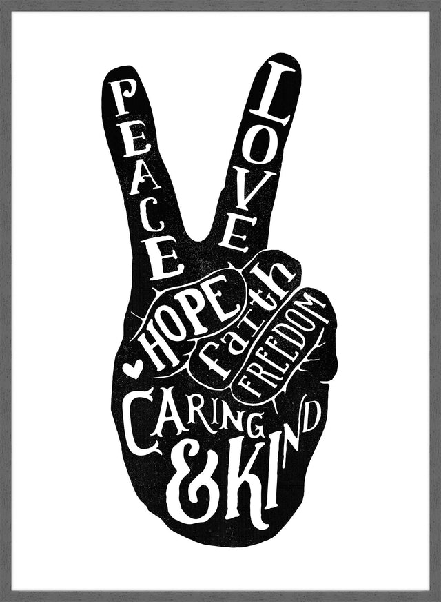 Minimal, black and white poster print with a peace finger sign and typography message. This print has been reproduced onto high quality archival fine art paper using a premium giclee printing process, with the latest fade resistant inks. Enhance your interior today with our stylish range of unique art prints.