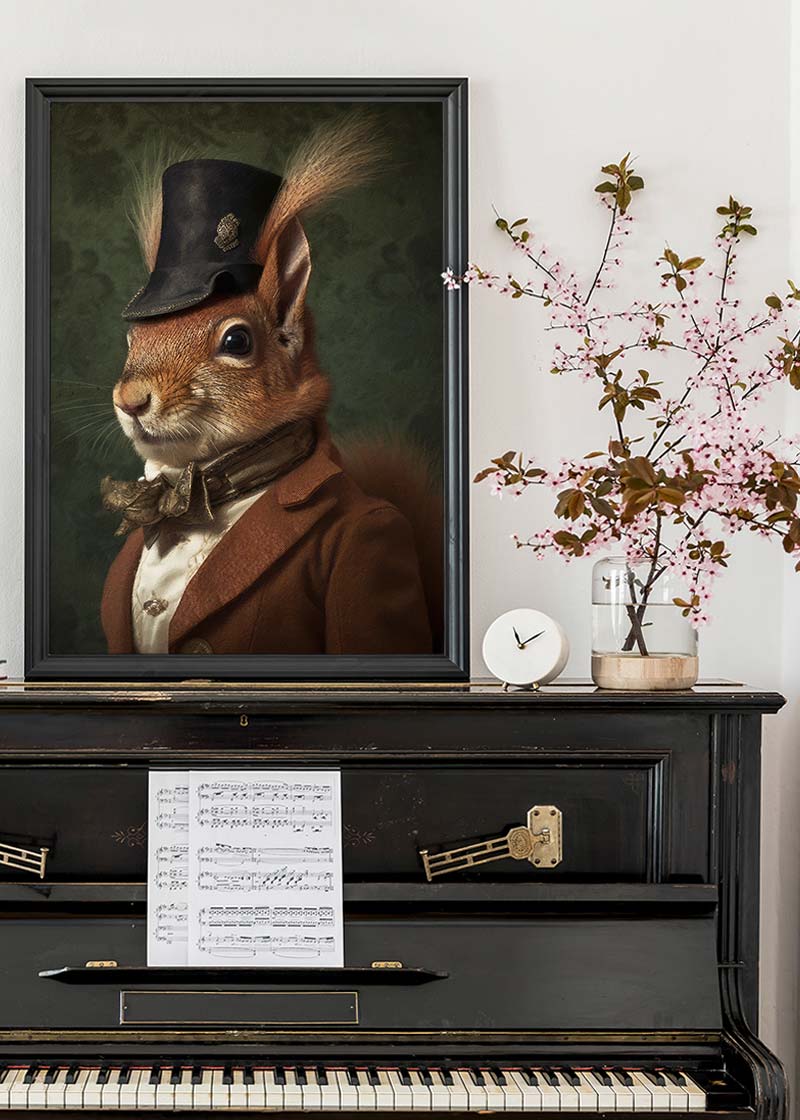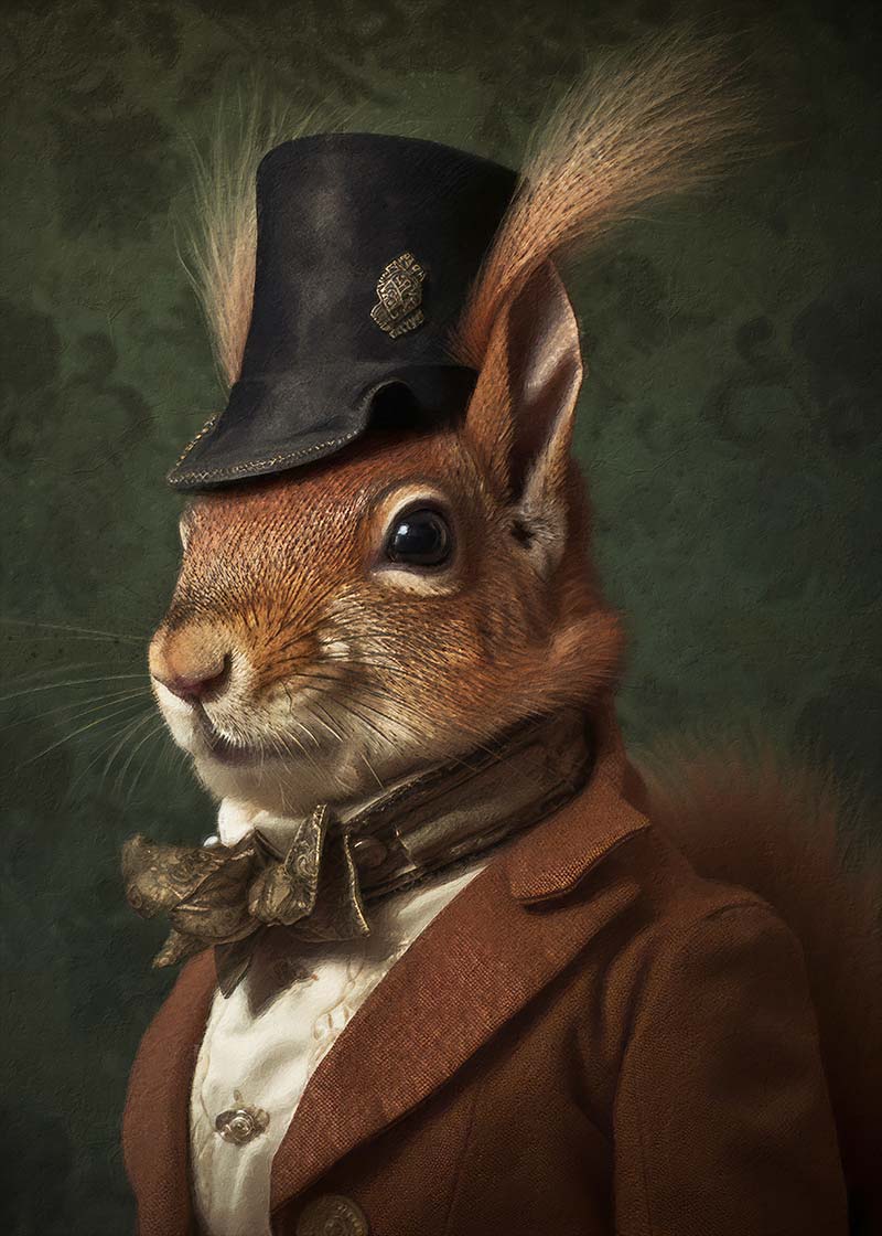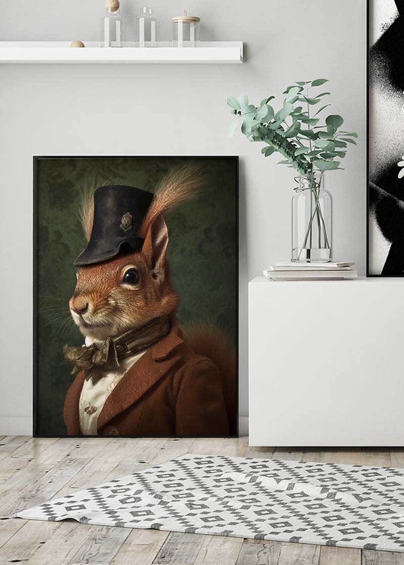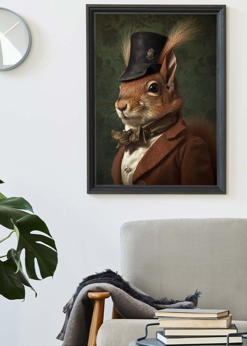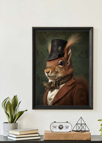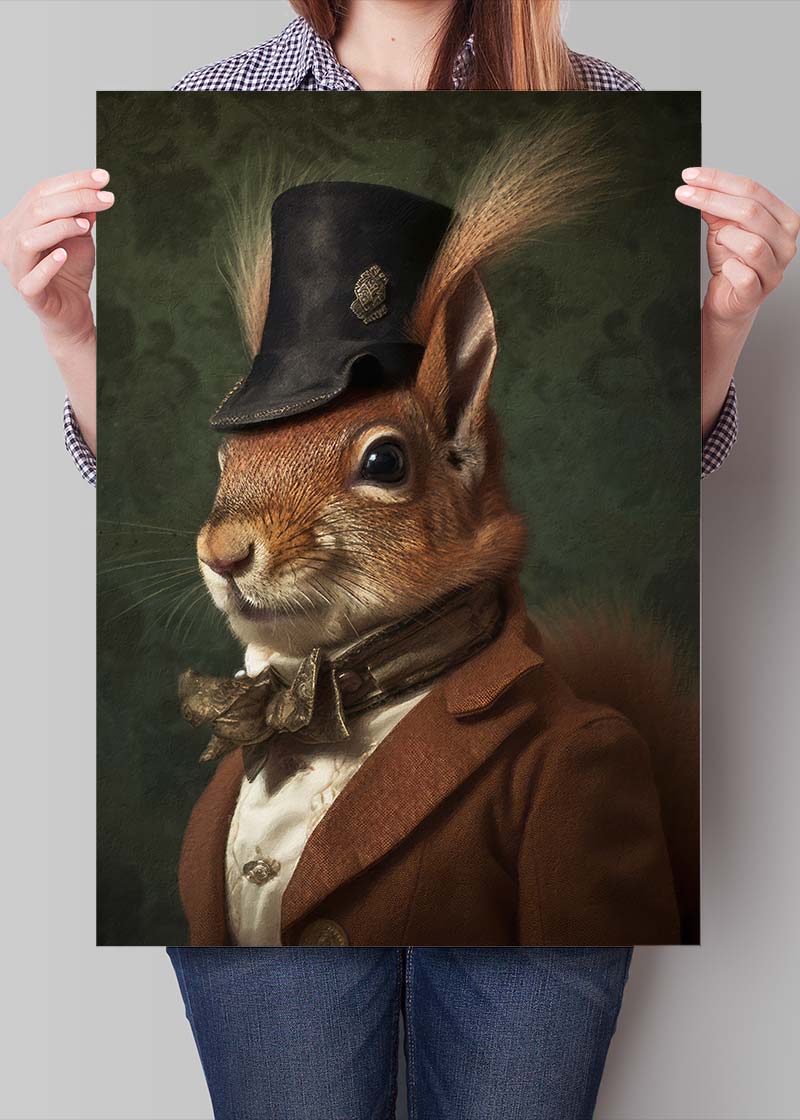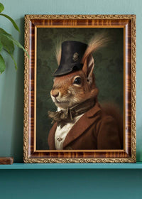 Introducing our "Red Squirrel Portrait" Art Print—a delightful and whimsical addition to your home decor. This high-quality art print showcases a one-of-a-kind, hilarious portrait of a squirrel with a human body, elegantly dressed in human clothes. This unique artwork is sure to bring a smile to anyone who sets their eyes on it.