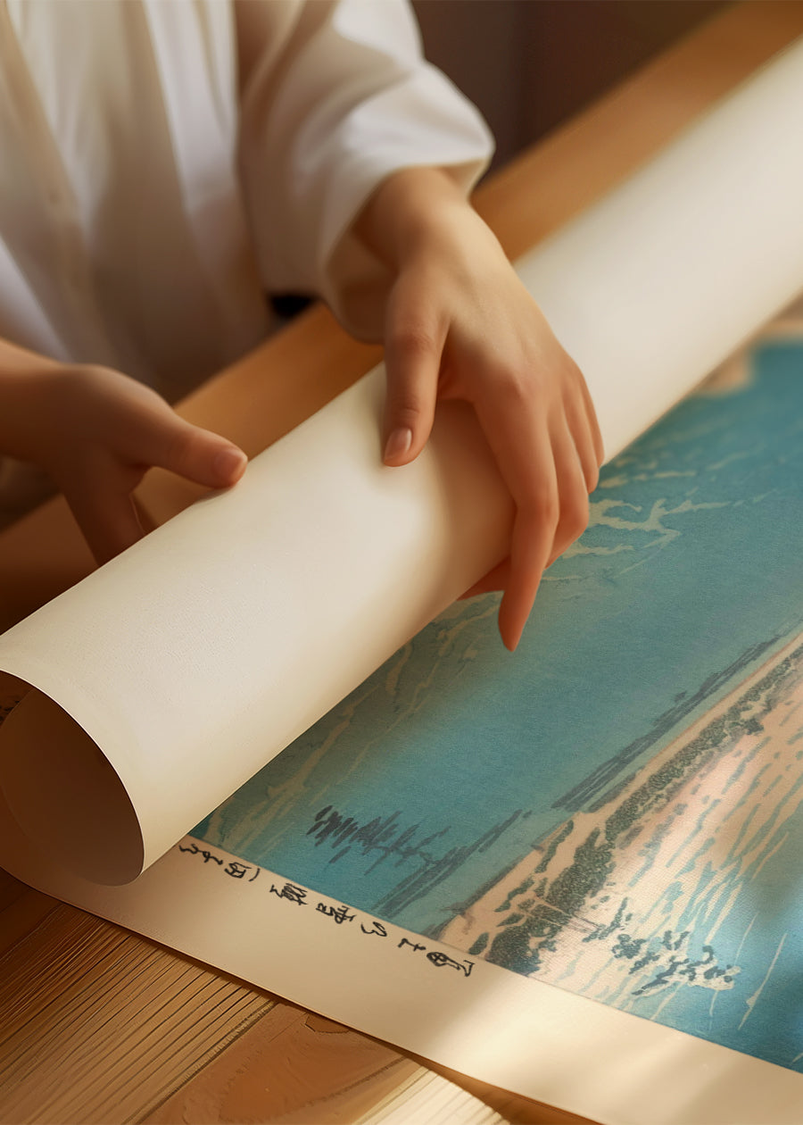 Woodblock printing, an ancient Japanese technique, adds a distinct charm to Kawase’s work, as each piece is meticulously carved, inked, and printed, resulting in vibrant, beautiful colors and intricate textures. This high-quality print, reproduced on premium matte art paper, enhances the richness of Kawase’s landscapes with a smooth, non-reflective finish that brings out every fine detail.