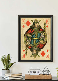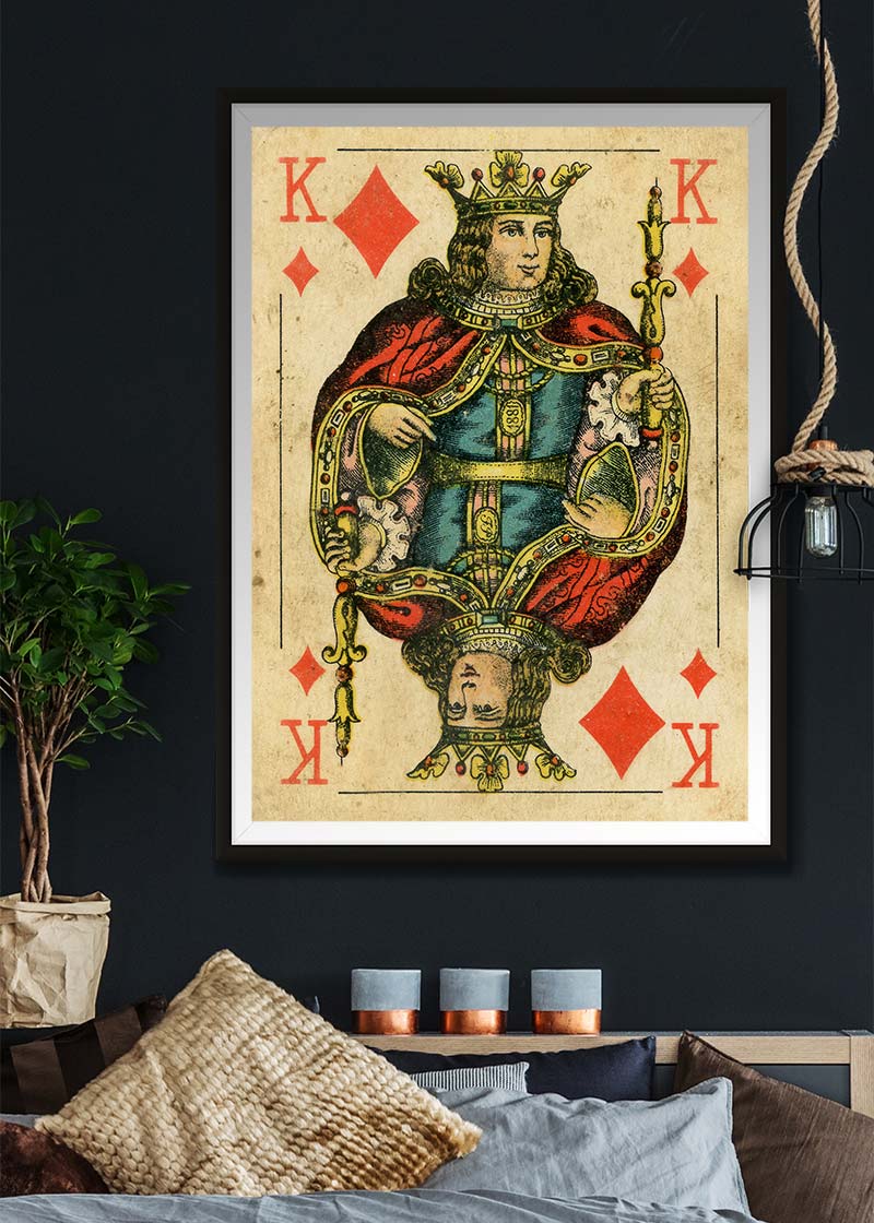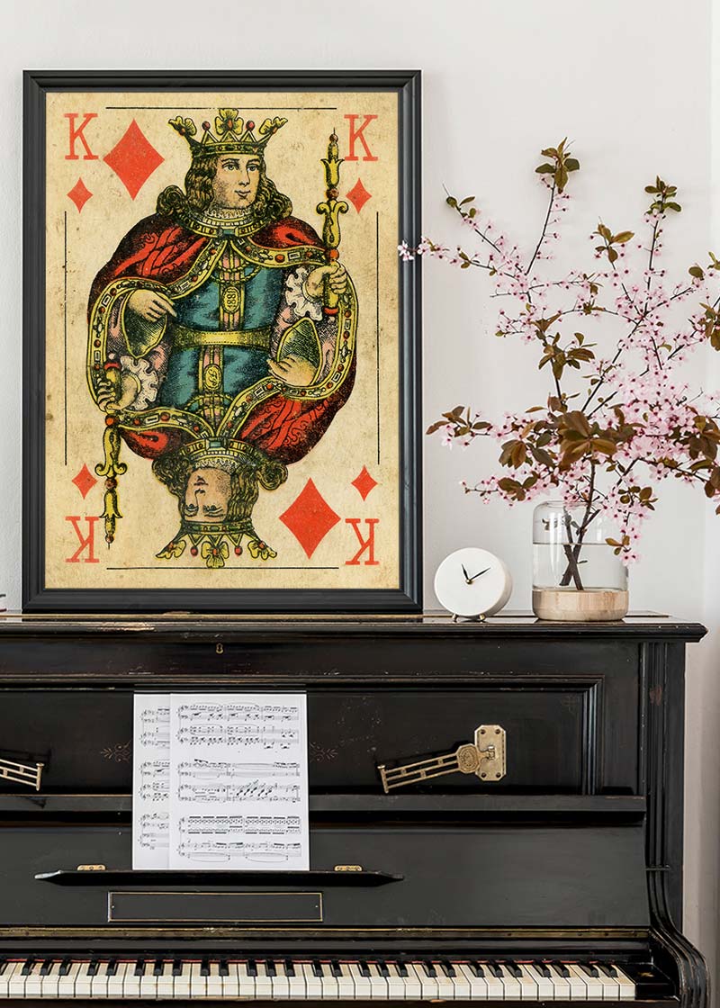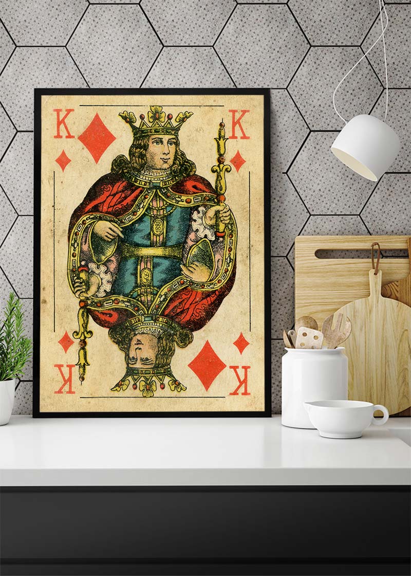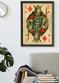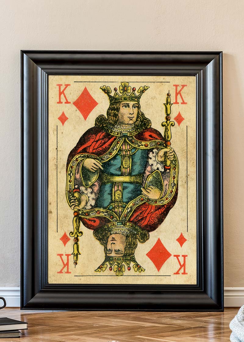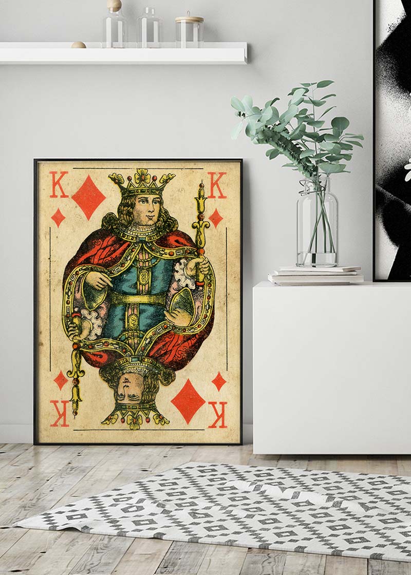 The muted color palette exudes sophistication, making it a versatile piece that complements any room. Whether in the living room, game room, or bedroom, this poster is a timeless statement piece. Its matte finish adds a touch of refinement, and the vintage charm elevates the ambiance of any space. Add character and warmth to your home with the Vintage Playing Card Poster Print – a stylish nod to the past that effortlessly enhances your interior.