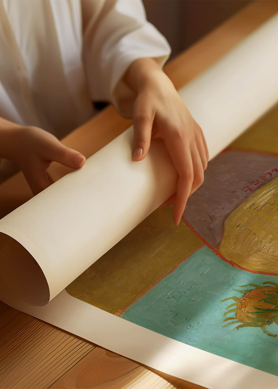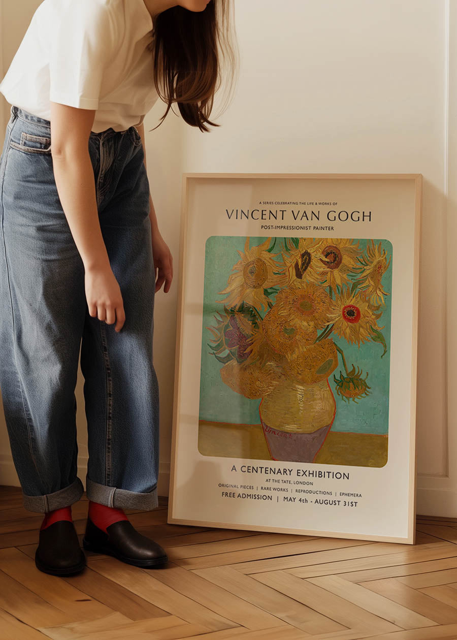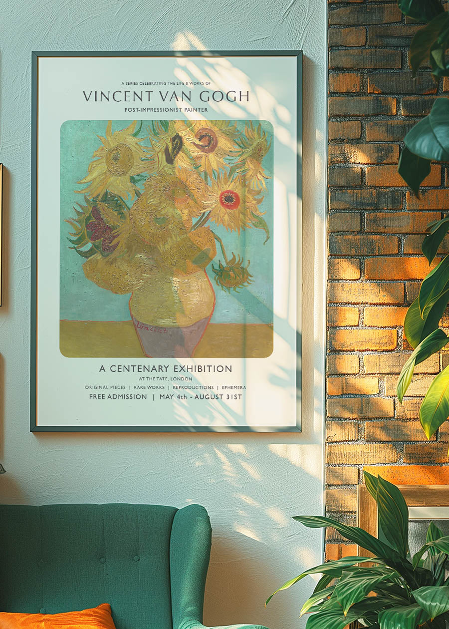 A vintage Art exhibition poster for the master painter Vincent Van Gogh. Featuring his well-known painted masterpiece Sunflowers, and beautifully designed typography details of the museum exhibition this poster is a beautifully framed, slick piece of art designed by our team in-house. You won't find it anywhere else!