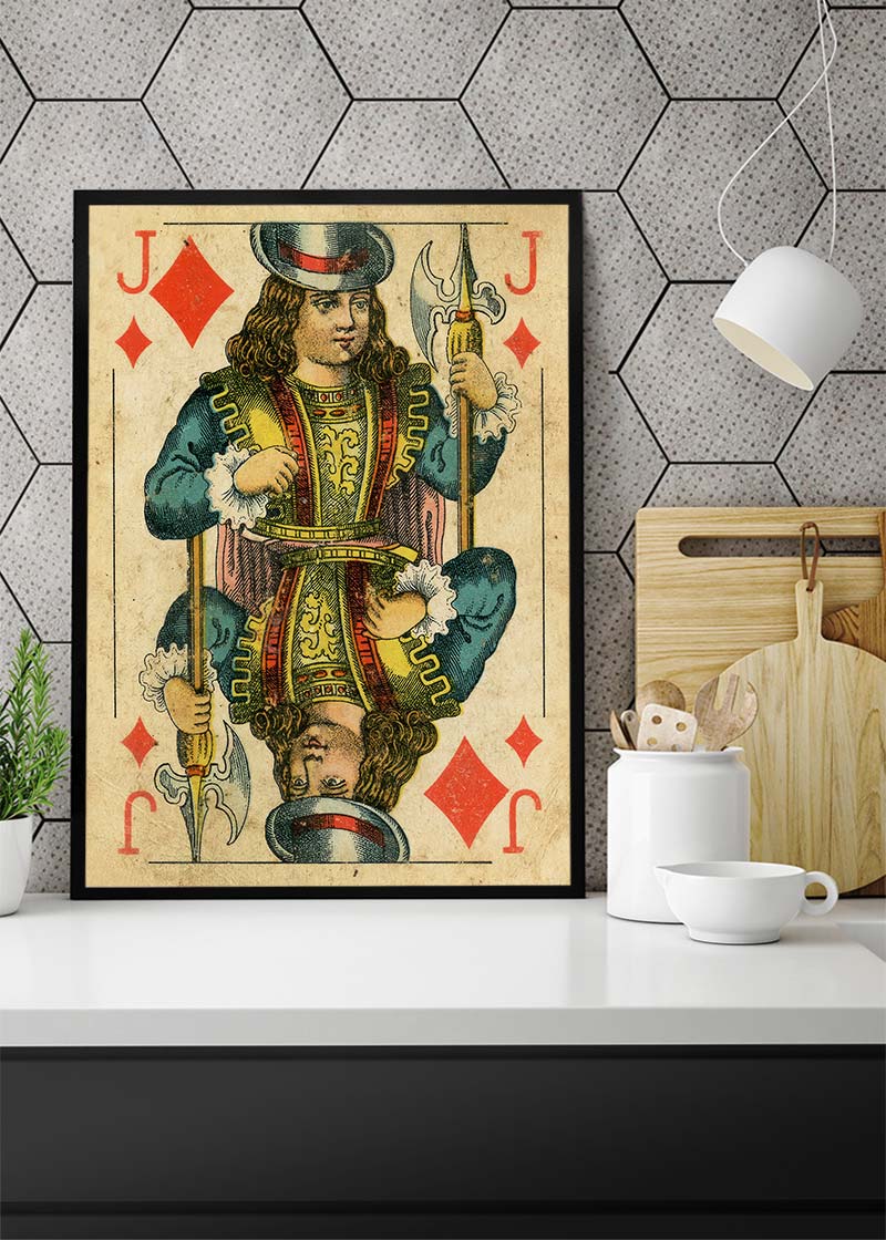The muted color palette exudes sophistication, making it a versatile piece that complements any room. Whether in the living room, game room, or bedroom, this poster is a timeless statement piece. Its matte finish adds a touch of refinement, and the vintage charm elevates the ambiance of any space. Add character and warmth to your home with the Vintage Playing Card Poster Print – a stylish nod to the past that effortlessly enhances your interior.