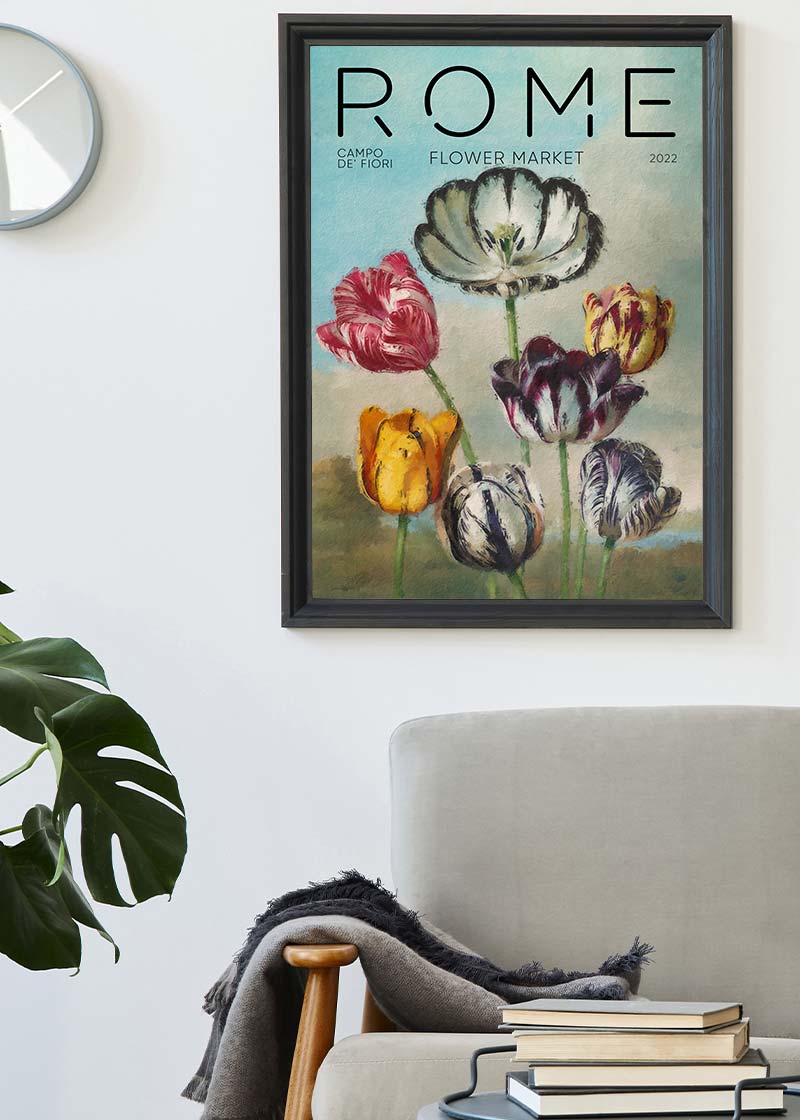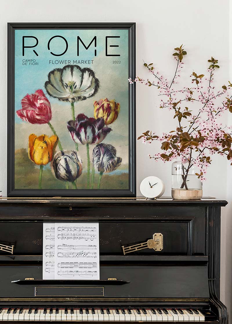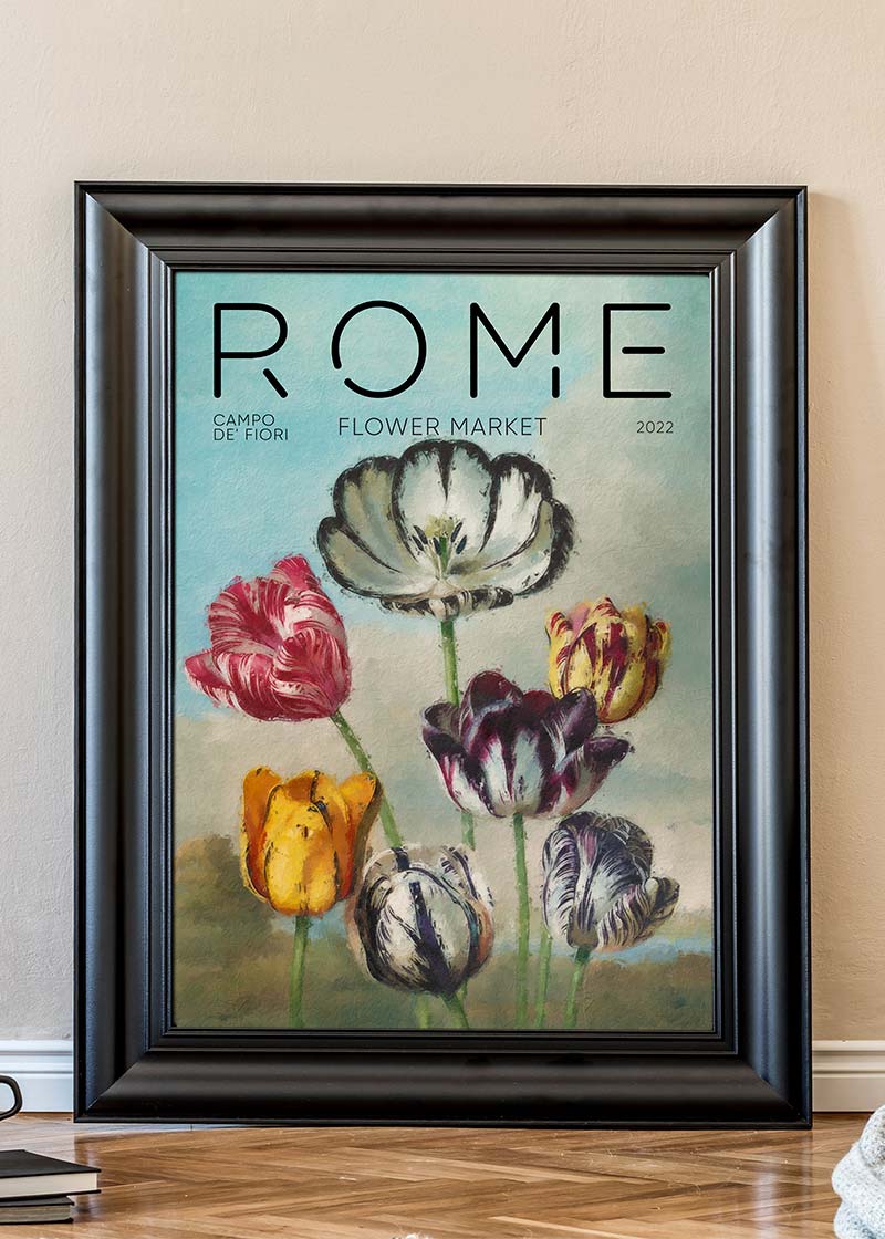 This premium-quality poster print features a stunningly detailed poster for the famed flower markets of Rome, bringing a refined touch of luxury to any home.
