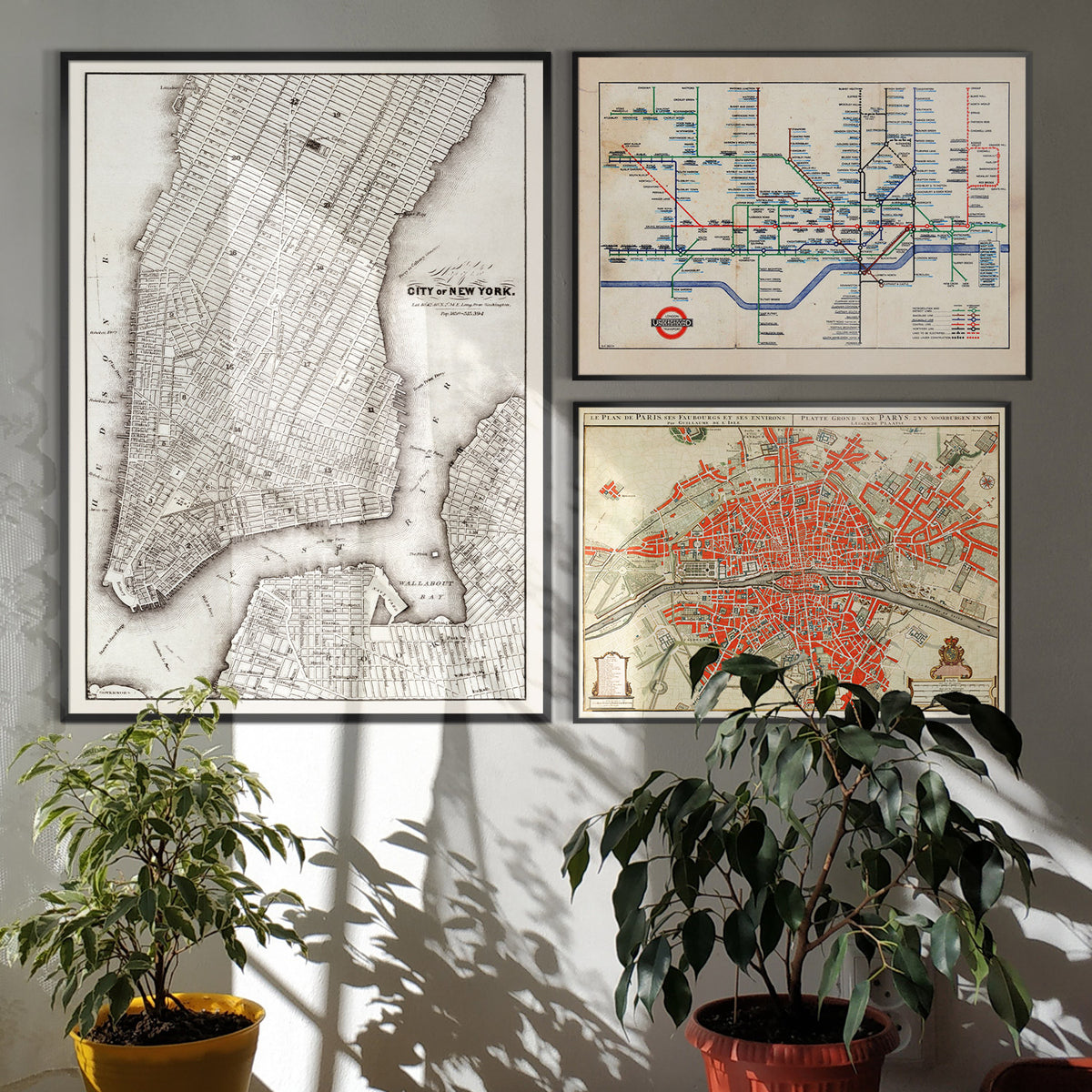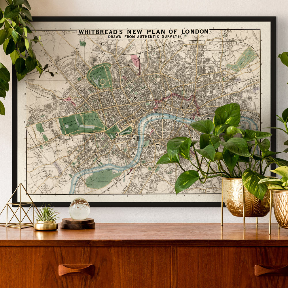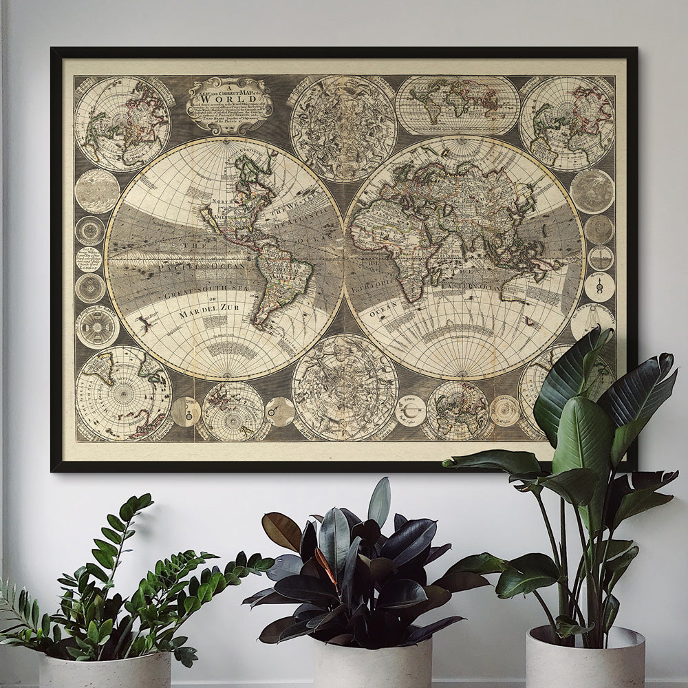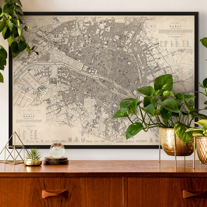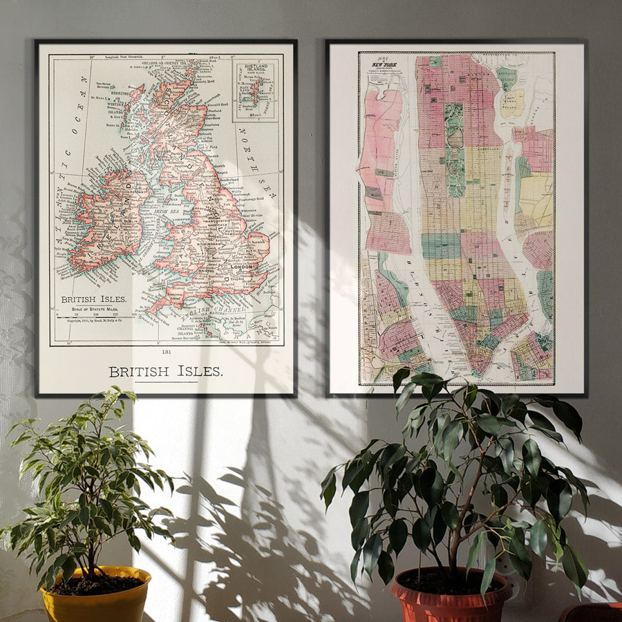 Posters and Prints featuring vintage maps. Maps of popular countries, cities, and continents are a really stylish addition to your wall. Choose your favourite dream destinations like New York, Paris, or London and we have vintage and antique maps featuring the area. A large-format old world map can be a fantastic talking point in your living room, and hanging in a large landscape format in one of our thin wooden frames can fill a wall.