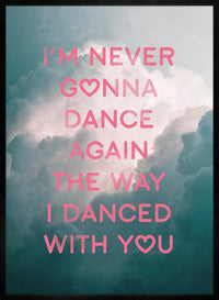 This print reads I'm Never Gonna Dance Again The Way I Danced With You in a pastel pink type against a photographic cloud background.