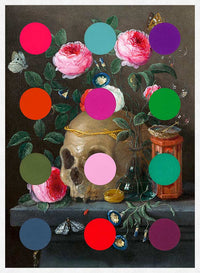 This modern art print is a vintage print of some beautiful flowers, painted by an old master featuring a skull and flowers. The print has been defaced with painted dots in the style of the infamous contemporary artist Damien Hirst, altered by our artist to create a unique design. The dot design will bring an element of whimsy to any room in your home that needs some sprucing up.