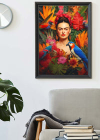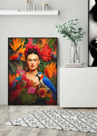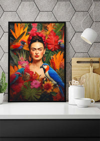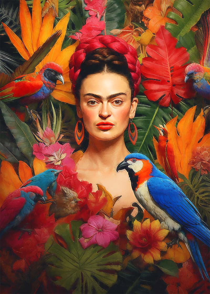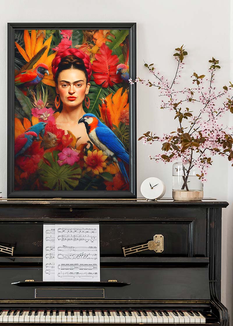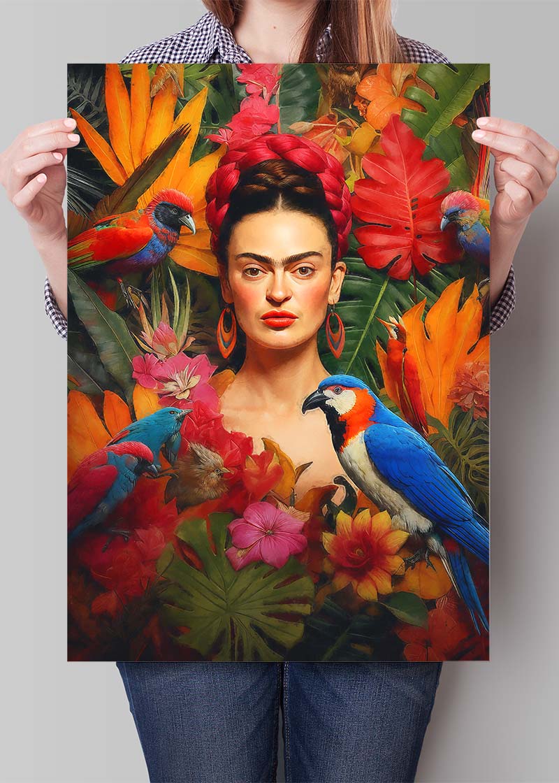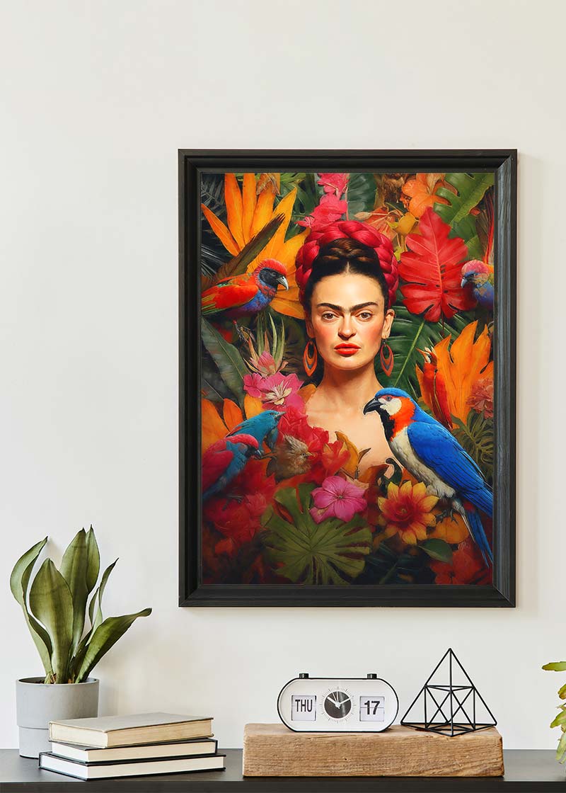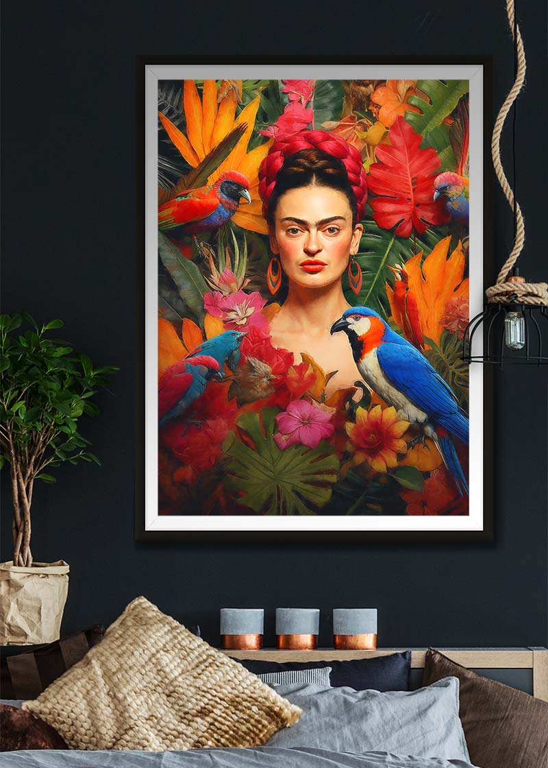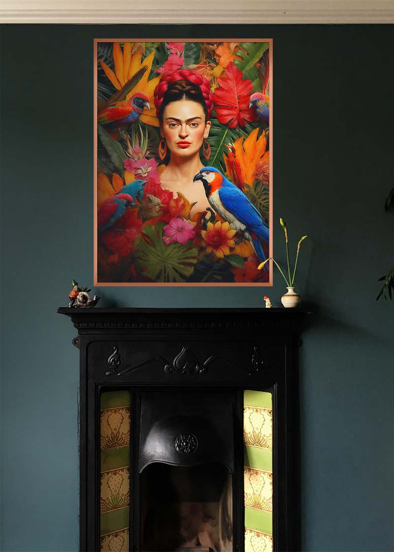 This Frida Poster print would fit perfectly into a maximalist interior design setting with its rich textures and bright colours.