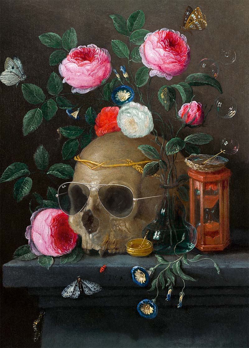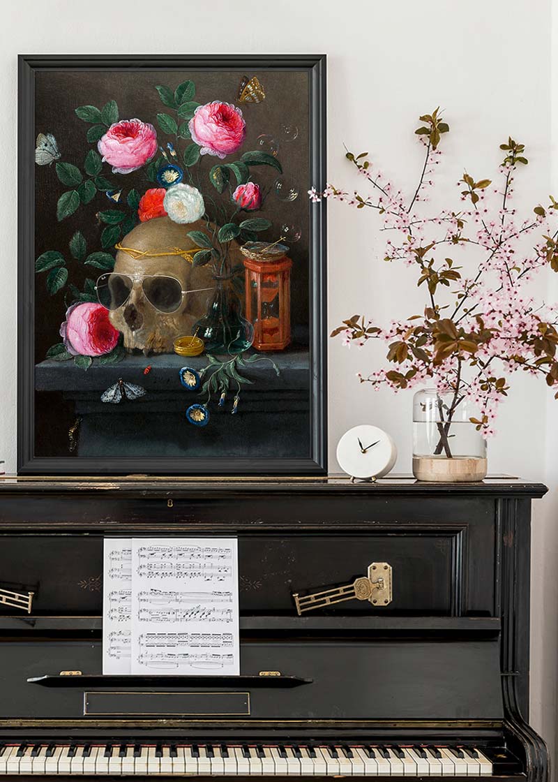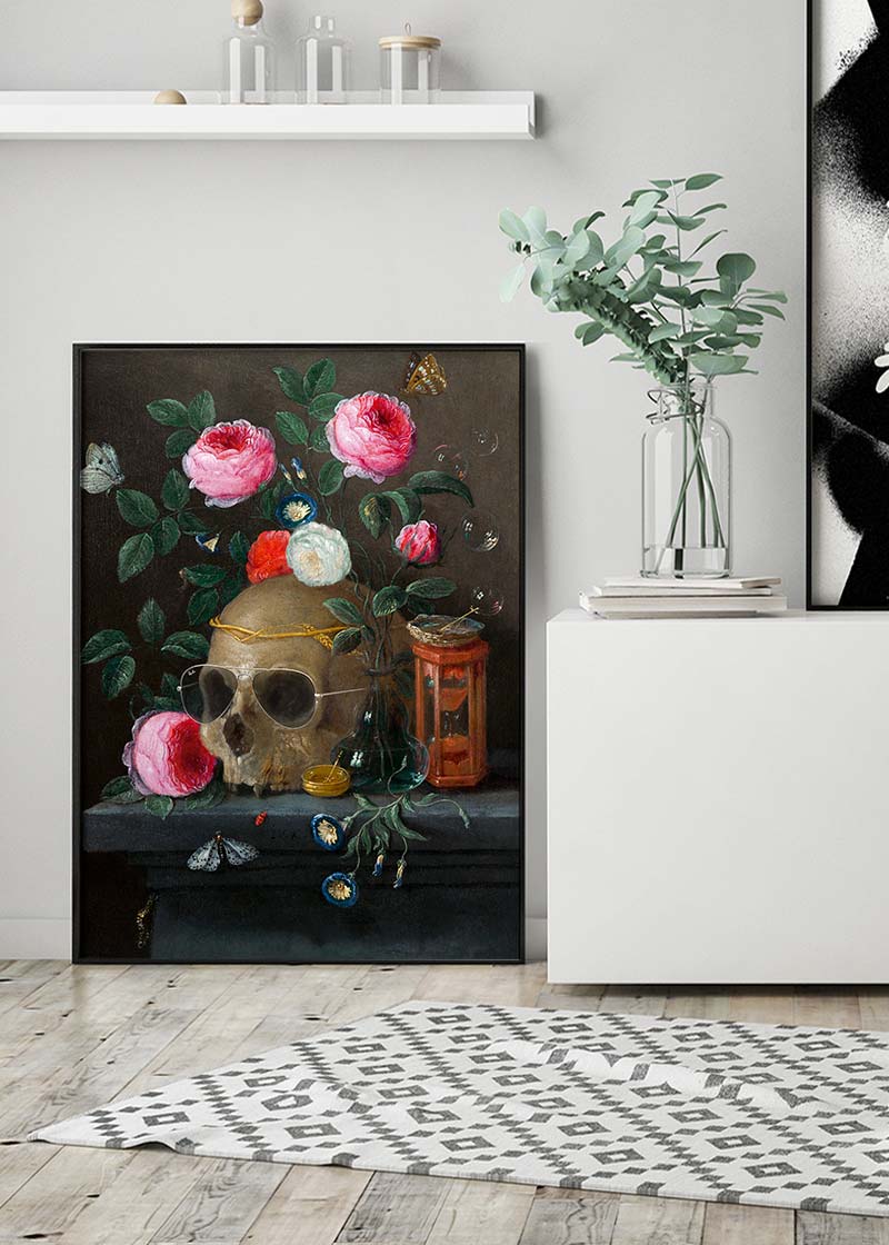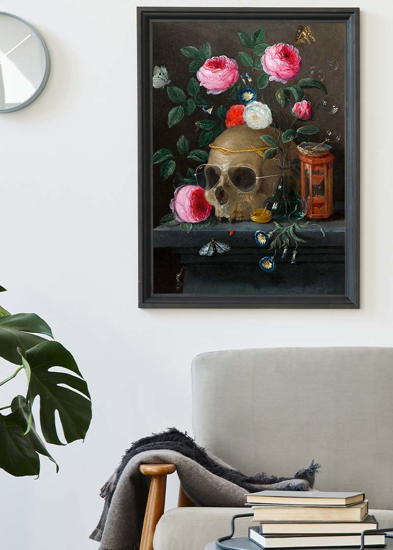 This famous painting of a skull and pink roses in still-life has subtle Ray-Ban aviator sunglasses added sure to bring a smile to the face of your guests. Will they even spot them!?