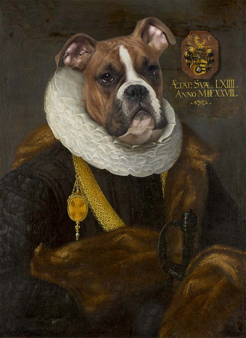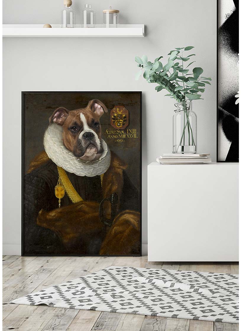 This high quality art print is a gorgeously detailed and finely crafted, altered art portrait featuring an adorable boxer dog in old style costume.