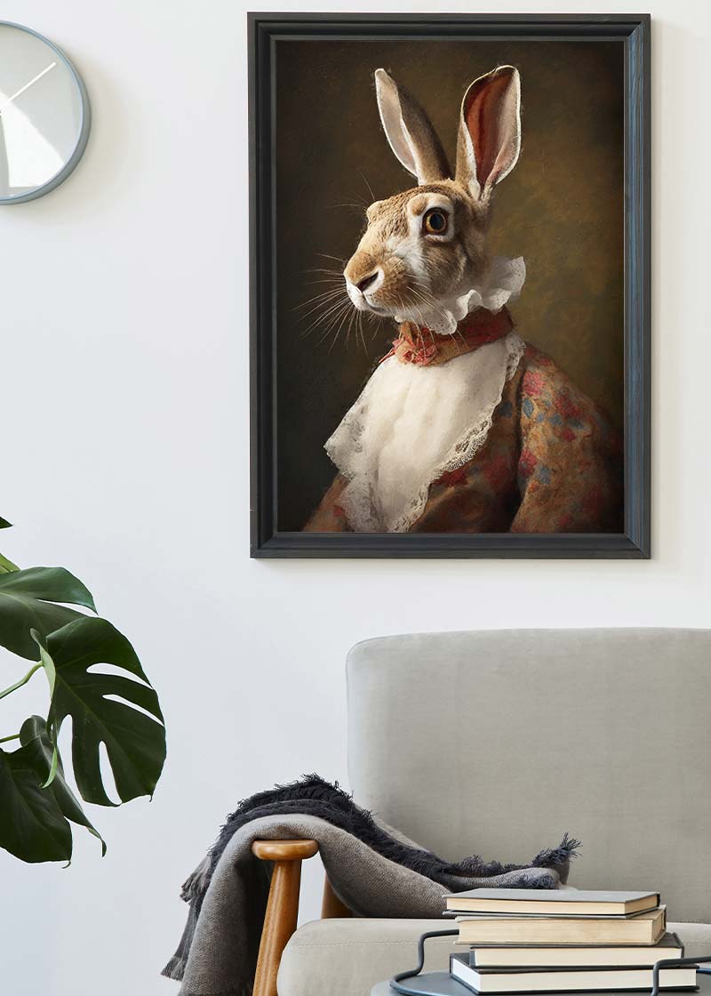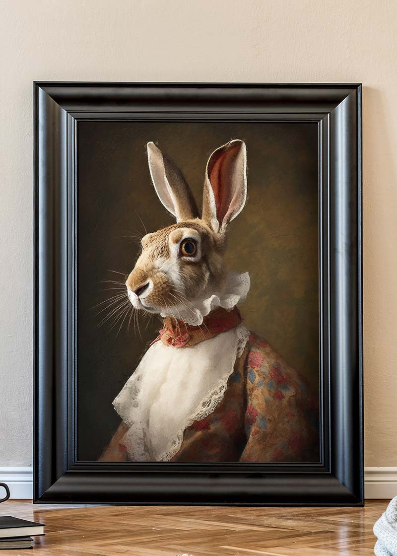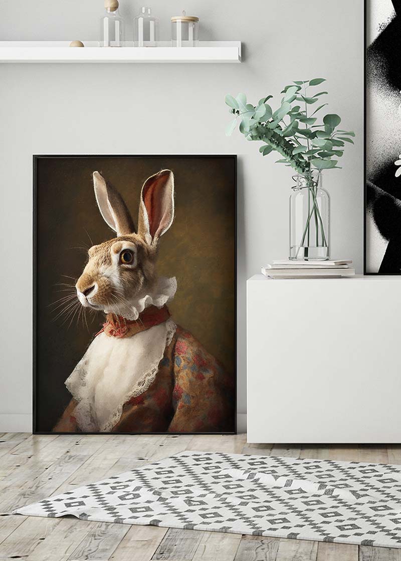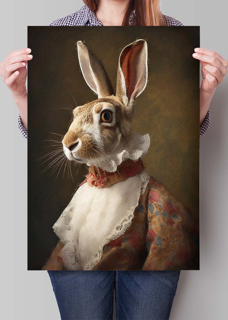 Introducing a charming and whimsical art print that is sure to capture your imagination—a humorous portrait featuring a hare with a human body, dressed in stylish human attire. This artwork is a one-of-a-kind masterpiece, promising to bring laughter and delight to your surroundings.
