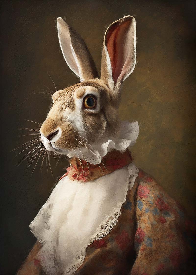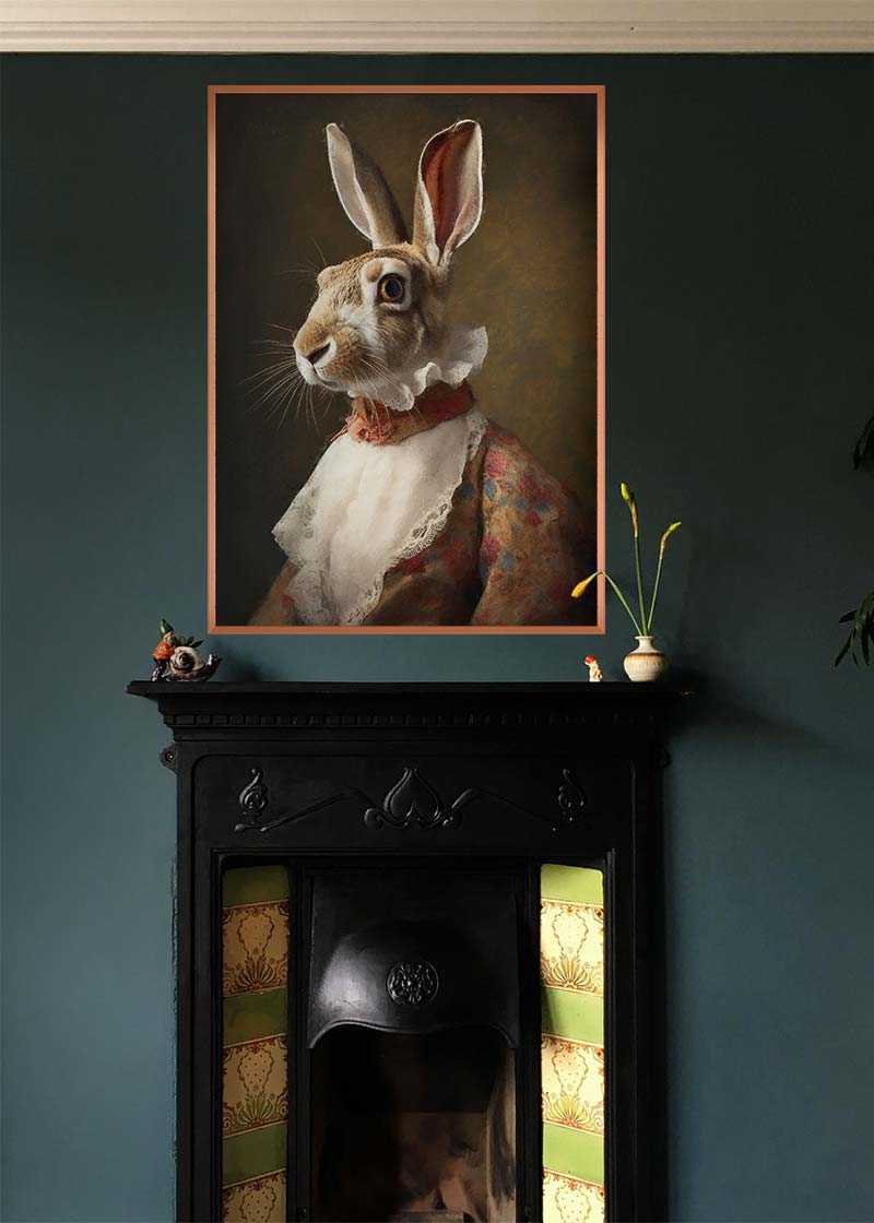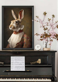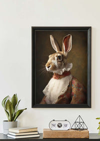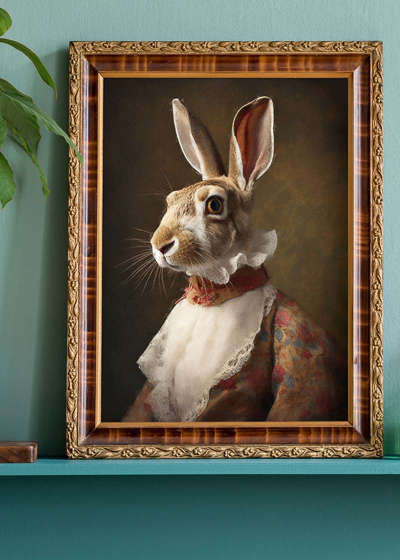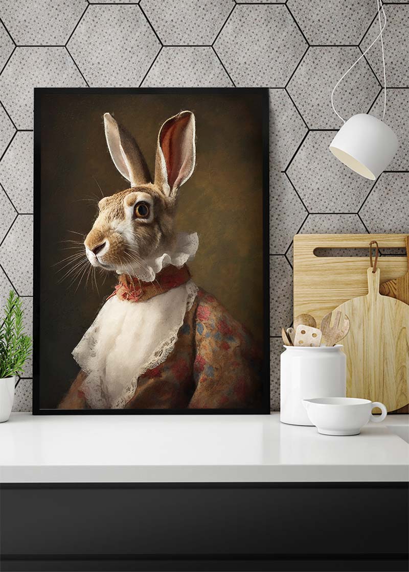 Introducing a charming and whimsical art print that is sure to capture your imagination—a humorous portrait featuring a hare with a human body, dressed in stylish human attire. This artwork is a one-of-a-kind masterpiece, promising to bring laughter and delight to your surroundings.