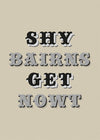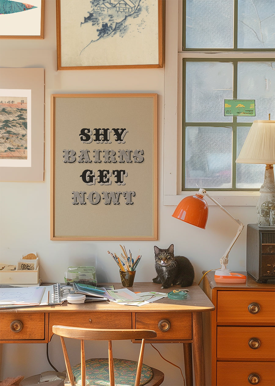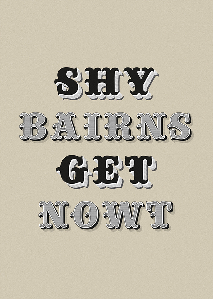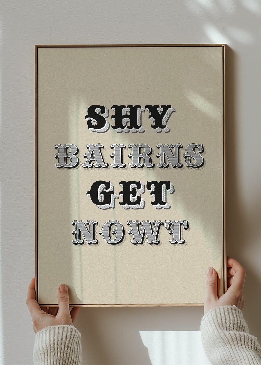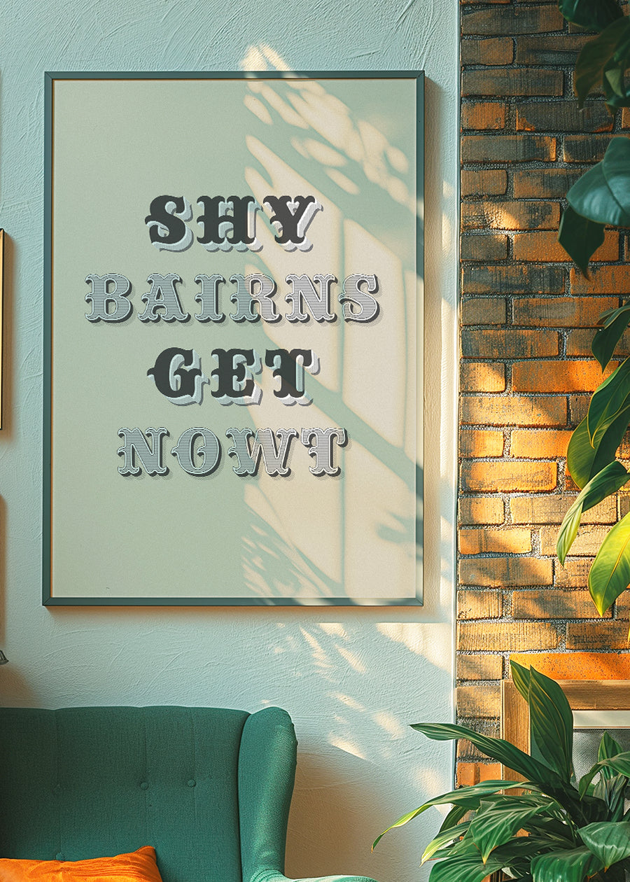 Make a statement with this striking Typography poster in large, confident type. Perfect for Northern dialect fans the print reads Shy Bairns Get Nowt in playful typography. Printed on high-quality matte paper for premium presentation, this piece brings Northern pride and personality to any room. A fun, stylish way to rep the North East.