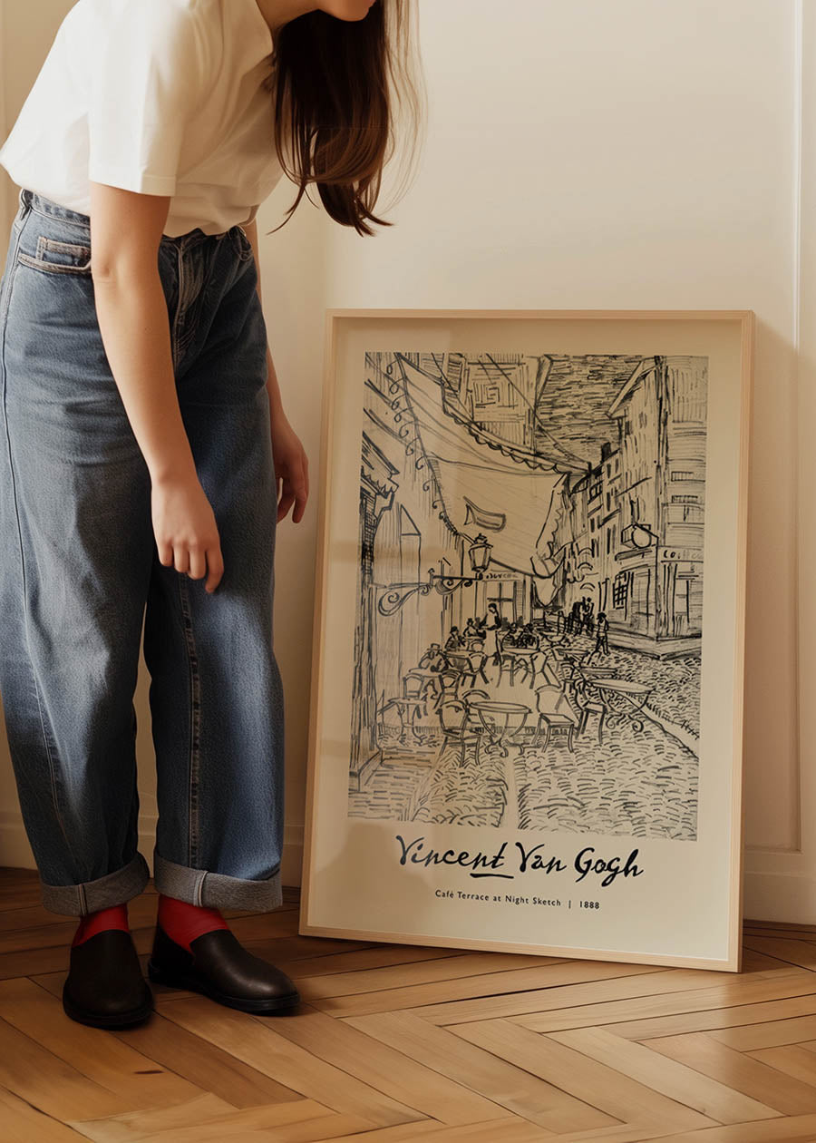 One of the less well-known aspect of Vincent Van Gogh's work is his outstanding pencil sketches, often studies for his more famous paintings. This pencil sketch study of 'cafe terrace at night' set on a stunning neutral background and featuring the signature handwriting of the man himself! This poster print will add a real touch of sophistication to a room.