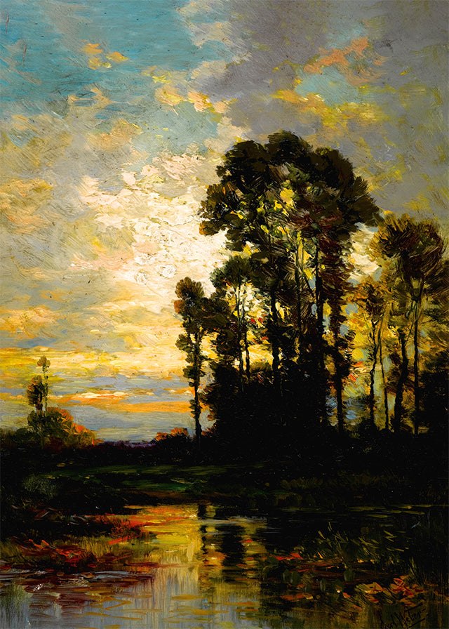 Transform your room with this high-quality, 230gsm matte art paper print of Carl Weber's sophisticated sunset painting. Available in 7 different sizes, this trendy reproduction is the perfect way to add a touch of elegance to your home decor. Experience the beauty of pastoral landscapes in an affordable and stylish way.