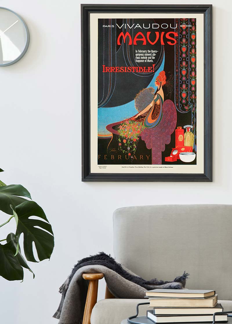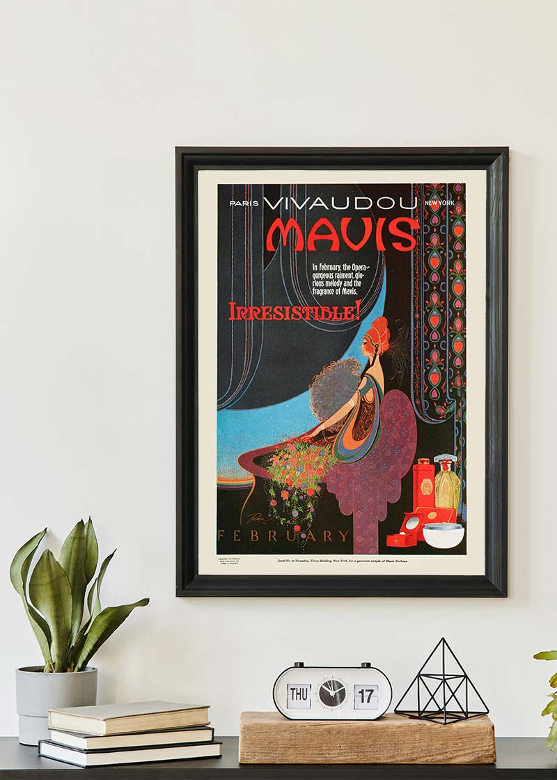 Bring a touch of vintage style to your interior decor with Vivaudous's Mavis perfume poster. This elegant piece features a beautiful art deco illustration that is sure to add a decorative charm to your room.