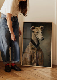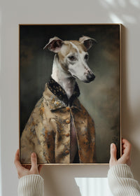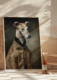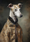 This stunning art print combines Renaissance elegance with playful surrealism, featuring the head of a Whippet on a regal human body. Rendered in a realistic painting style, the detailed textures of the dog's fur and finely crafted garments evoke classic Renaissance portraiture. Ideal for dog lovers and art enthusiasts alike, this high-quality print captures the essence of both human and animal forms, creating a fantastic and eye-catching piece. Perfect for any home or office, this unique dog head print adds sophistication and a touch of humor. Elevate your space with this captivating animal head artwork.