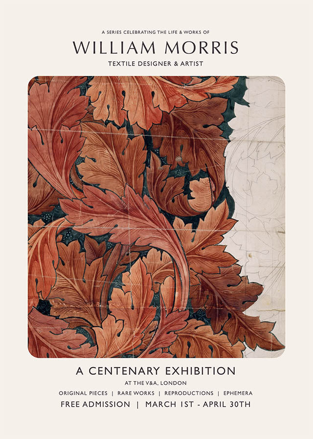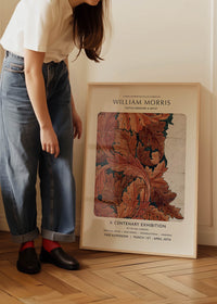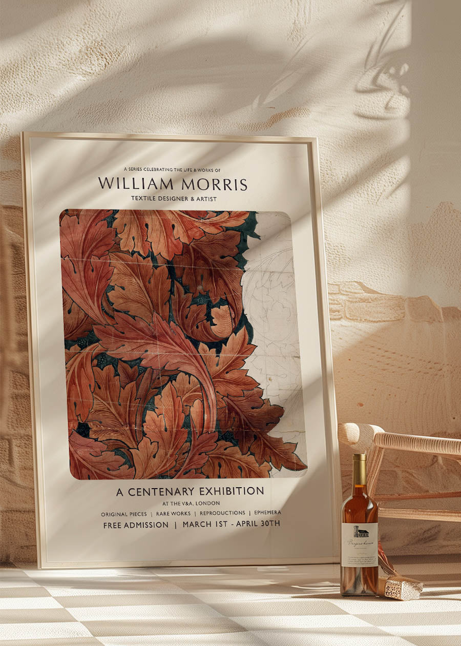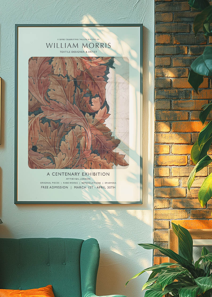 A vintage Art exhibition poster for the master William Morris. Featuring his well-known style of pattern, leaves and nature, and beautifully designed typography details of the museum exhibition this poster is a beautifully framed, slick piece of art designed by our team in-house. You won't find it anywhere else!