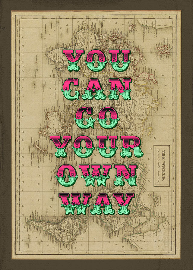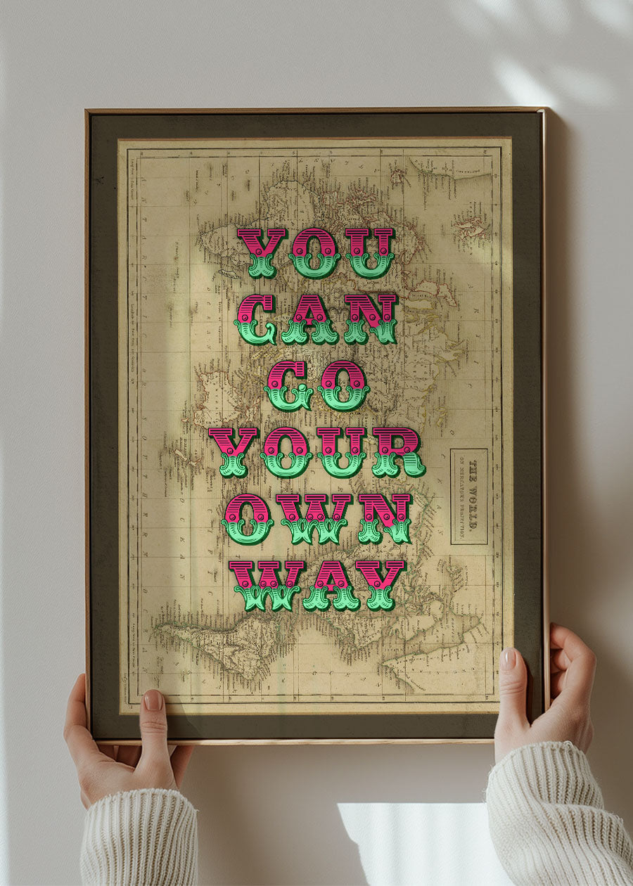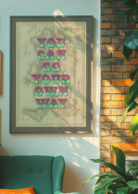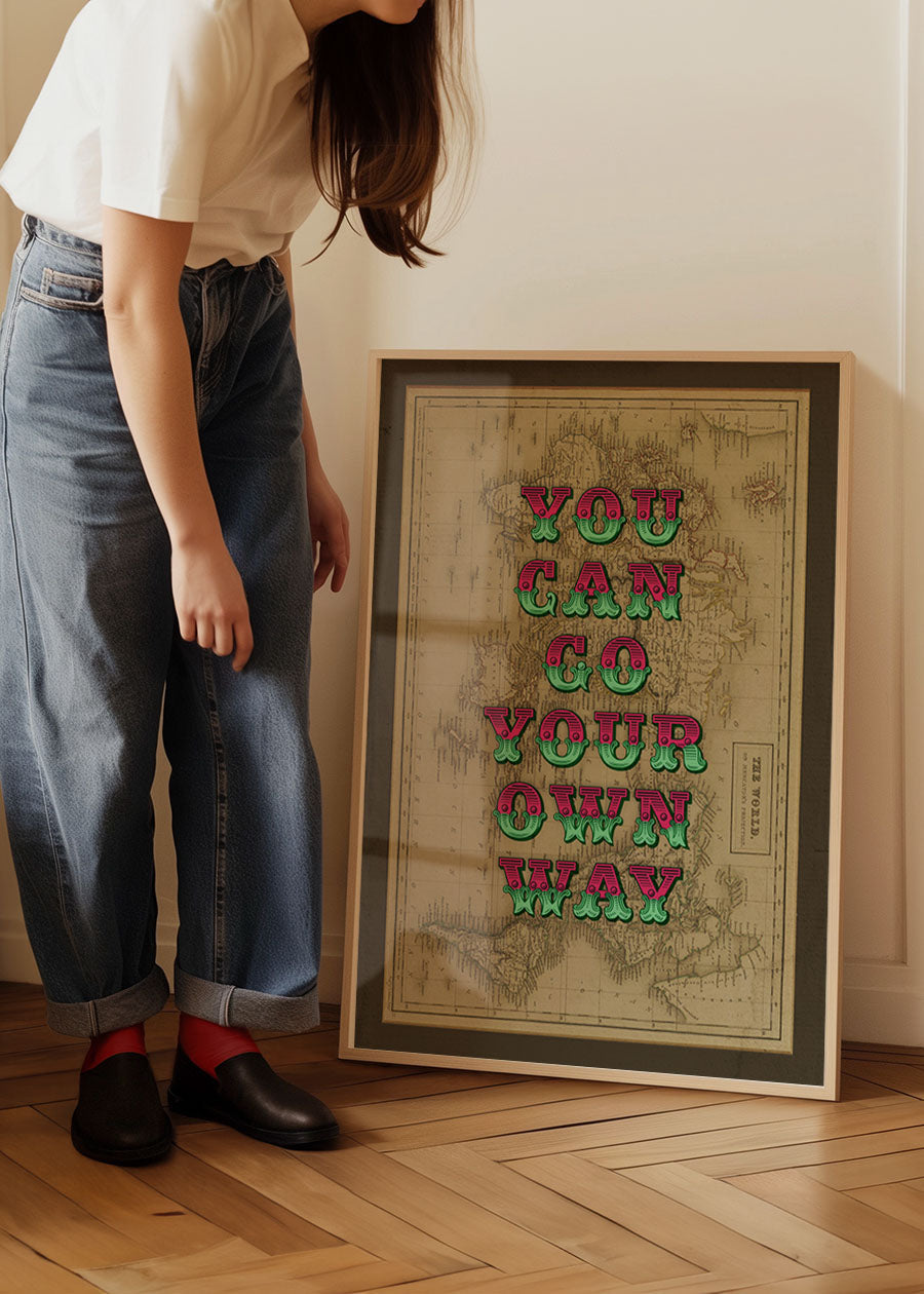 Celebrate individuality with this matte poster print featuring the empowering lyrics of Fleetwood Mac's "Go Your Own Way," set against a vintage world map backdrop. The design showcases circus-style, bright pop-colored lettering that adds a playful and vibrant twist to the iconic song. The matte finish ensures a glare-free display, highlighting the poster's nostalgic and adventurous appeal. Ideal for music enthusiasts and free spirits, this artwork inspires courage and self-discovery. Perfect for any room in need of artistic flair and motivational charm, this poster invites you to embrace your journey with boldness and timeless style.